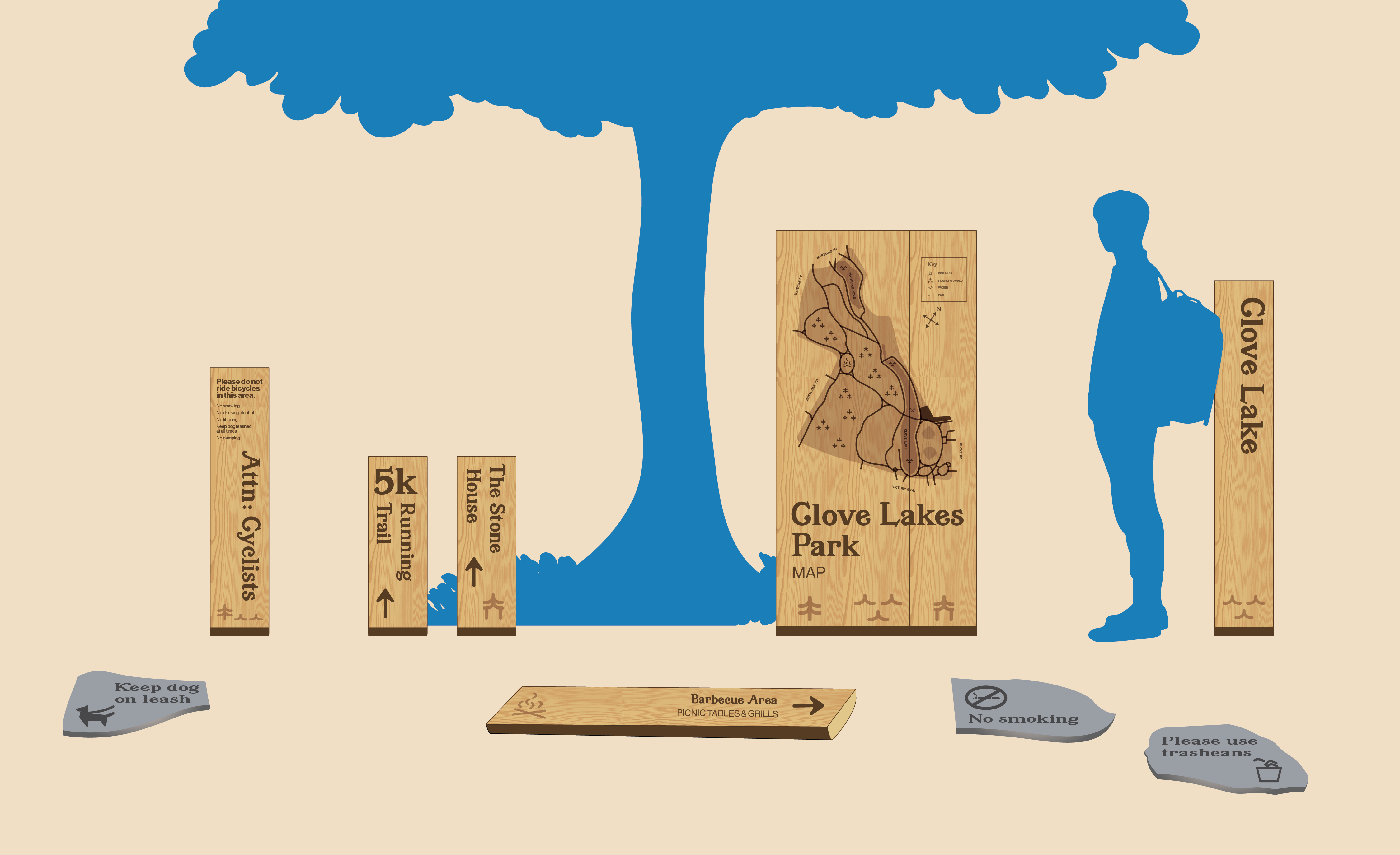 Intended as a complement to Biome, Staten Island, this project provides a wayfinding system that is incorporated into the natural environment. Signage is modeled after features of the surrounding park, such as logs and stones, and directs visitors to areas of interest and exits. Regulatory and map graphics are included in this system as well.