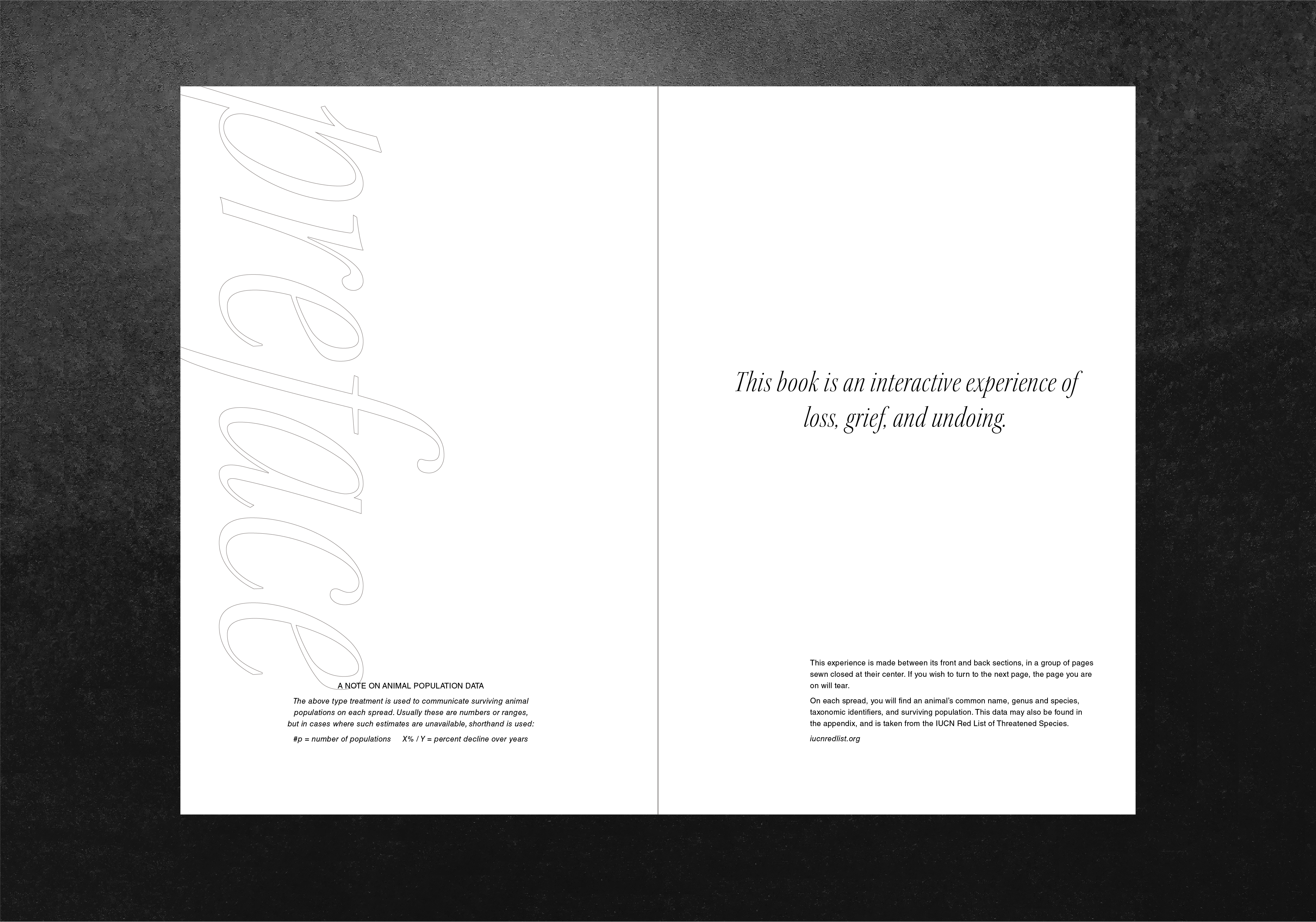 This undergraduate thesis was a response to the human-driven climate crisis and animal species directly threatened to extinction as a result. Rhetorical connections are drawn between the devaluation of the natural world and humanity’s self-focused drive towards industrialization and production that undergirds the climate crisis, resulting in a bound object that the user must tear apart to proceed through the work.