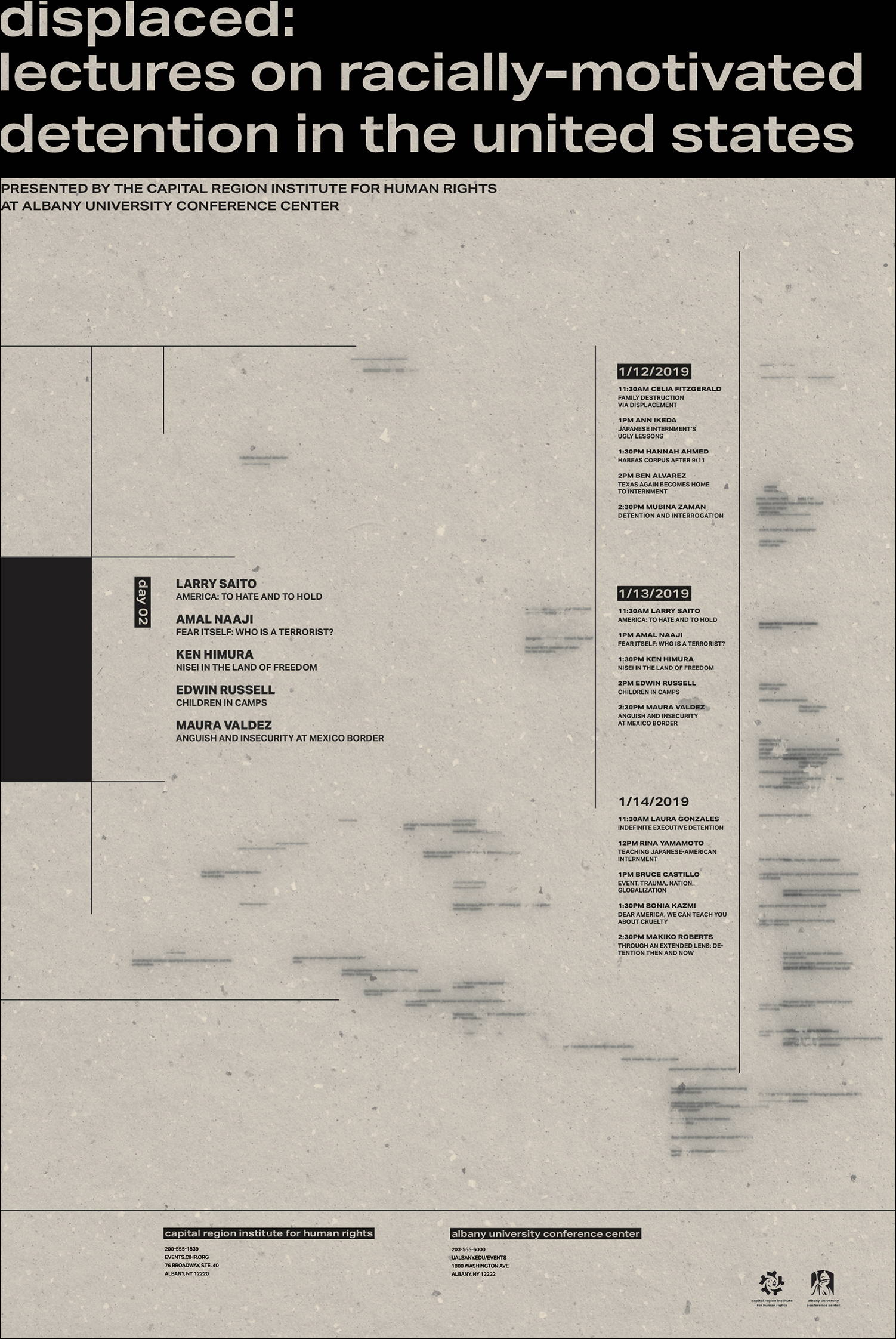 Change in background texture, dominance of black space, and increasingly constrictive rules communicate the sinister bureaucracy that defines government detention. Blurred typographic forms further this narrative, as they are highlighted and gathered into a confined space.